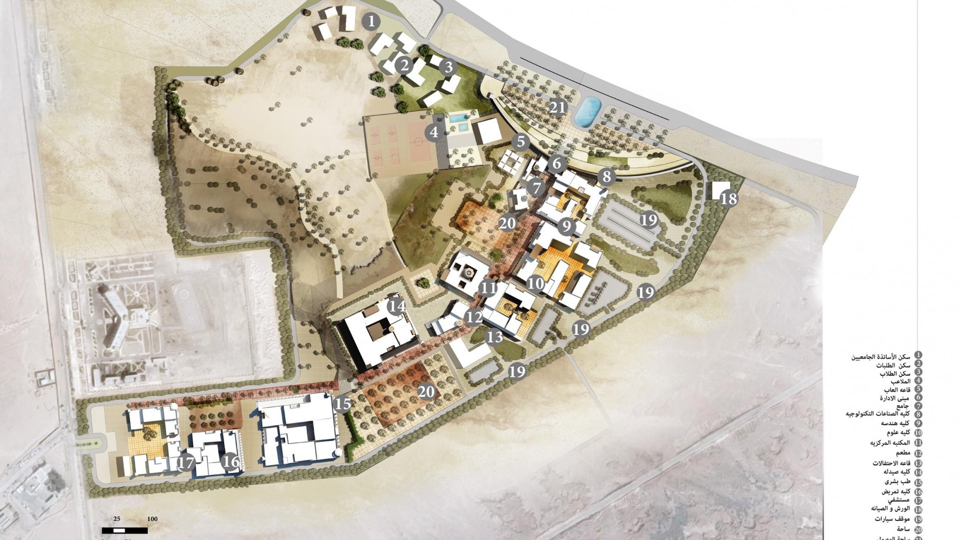 As part of the Egypt/Saudi funding agreements worth roughly 22 Billion USD, the Saudi King Salman Bin Abdul Aziz University Project is planned to be situated in south Sinai. The University will have its head offices in El-Tur Sinai hosting six faculties on 860,000 meters squared land. When completed, the project is slated to have 260,000 meters square of BUA. The following faculties are contained in the campus; Faculty of Technological Industries, Faculty of Marine Sciences, Faculty of Engineering, Faculty of Medicine with associated Educational Hospital, Faculty of Pharmacy & Faculty of Business Administration in addition to university services and dorms. EHAF was awarded the contracts for providing architecture pre-concept, complete engineering design and construction supervision services for the project.